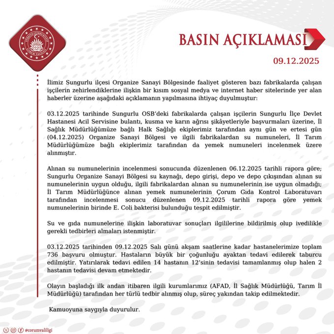 Çorum Valiliği, kamuoyunu bilgilendirmek amacıyla detaylı bir açıklama yaptı. Yapılan incelemeler sonucunda yemek numuneleri laboratuvar ortamında analiz edildi. Analiz sonuçları, olayın gıda kaynaklı olduğunu doğruladı. Çorum işçi zehirlenmesi olayının temel nedeninin yemeklerdeki hijyen eksikliği olduğu anlaşıldı. Yetkililer, bu tür olayların tekrar etmemesi için denetimlerin sıkılaştırılacağını vurguladı.